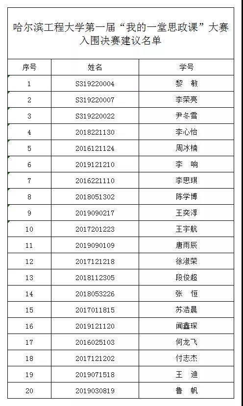 截止2019年11月15日,tcy8722太阳集团第一届“我的一堂思政课”大赛共有70名同学报名参加,其中50名同学的作品成功进入大赛初赛。经大赛评审委员会对参赛作品评审后,共有20位同学成功入围决赛。现将入围决赛建议名单公布如下(按评分成绩由高到低排序):