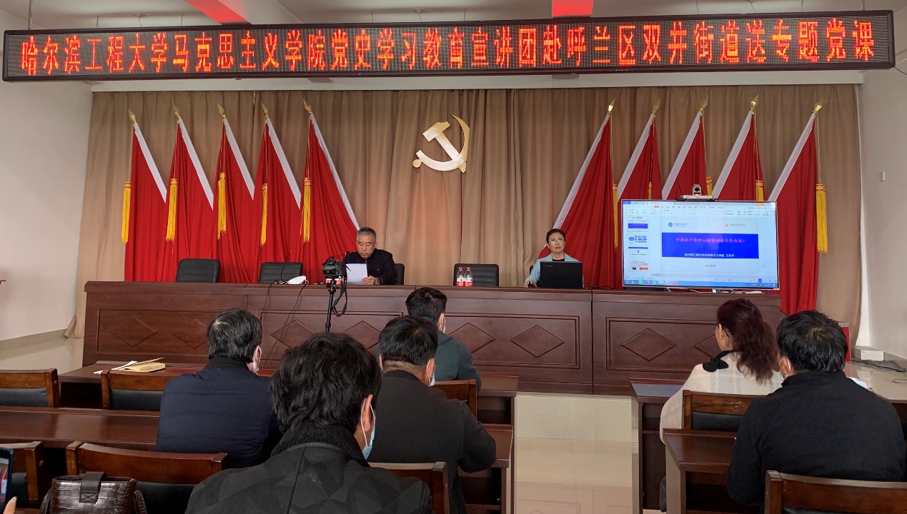 5月8日,为庆祝中国共产党成立100周年,引导广大基层党员干部知党史、颂党恩、听党话、跟党走,增进基层党员干部党性修养,老太阳集团tcy8722习近平新时代中国特色社会主义思想“四进”宣讲团选派骨干教师到呼兰区双井街道,开展“党史学习教育”宣讲活动。呼兰区双井街道100余名党政机关干部、各村“两委”班子成员等参加了此次宣讲活动。