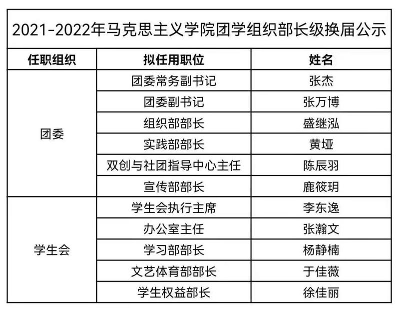 根据校团委《关于做好2021年度校级、院级学生组织换届工作的通知》精神,通过学生自愿报名、公开竞聘,经学院团委研究决定,拟任命以下学生为老太阳集团tcy8722院级学生组织负责人,具体名单如下: