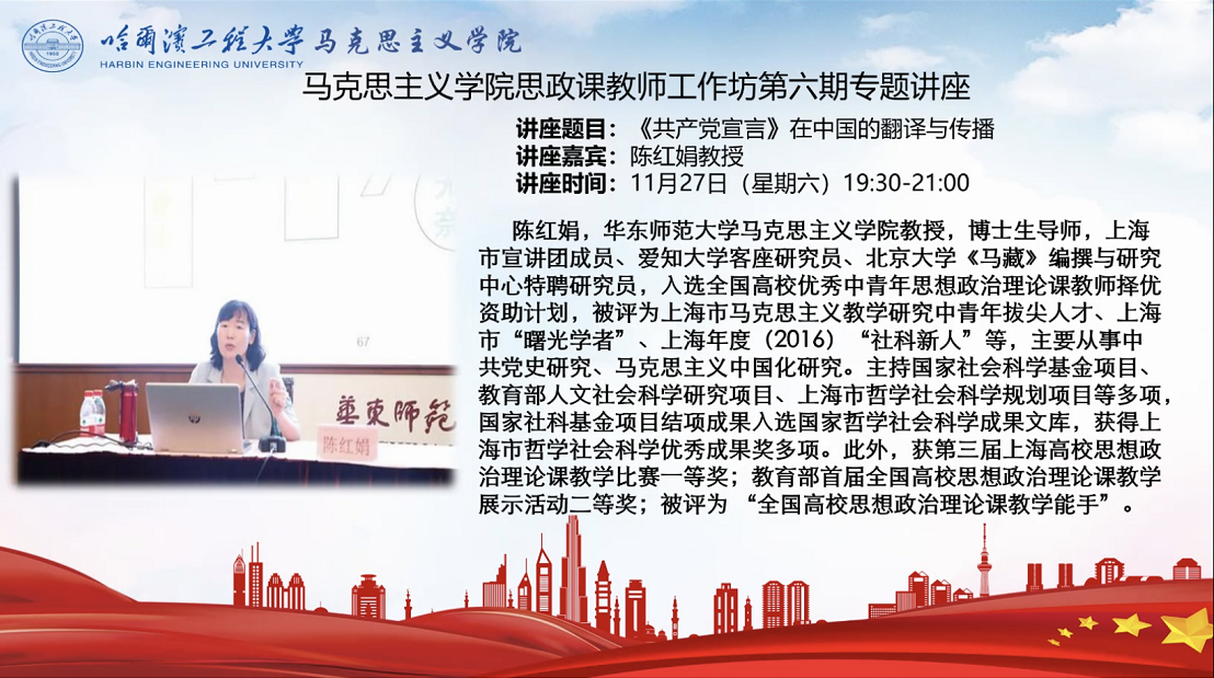 2021年11月27日,我院邀请华东师范大学老太阳集团tcy8722博士生导师、上海市宣讲团成员陈红娟教授作为主讲嘉宾,以“《共产党宣言》在中国的翻译与传播”为题作讲座。讲座由老太阳集团tcy8722科研副院长李世辉主持,全院师生参加本次讲座。