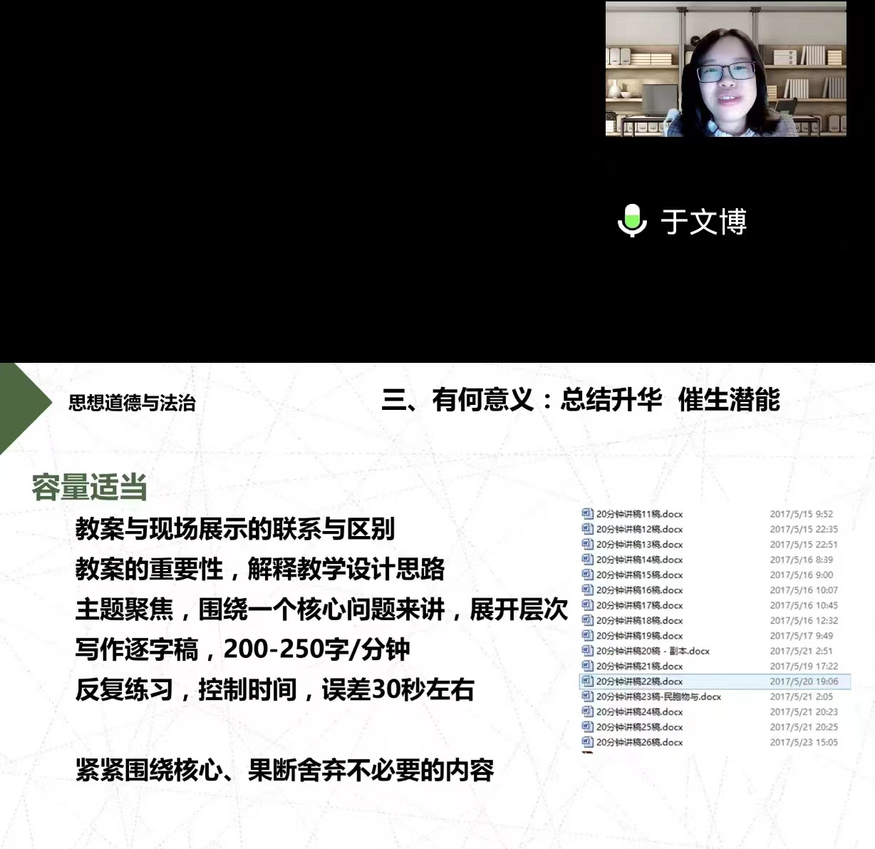 于文博教授围绕怎样上好一门思政课,从课程准备、课程设计、课程改革的实际出发,阐释青年思政课教师如何从站上讲台到站稳讲台、从站好讲台到用好讲台、从享受讲台到成就讲台,更好坚守育人初心、充分发挥立德树人关键课程的关键作用。分享了自己多次参加高校思政课教学比赛的经验,从落实党和国家立德树人根本任务部署的要求、顺应高校思政课内涵式高质量发展的趋势、提高高校思政课教师特别是青年教师的教学能力水平等方面进行了细致讲解,并对2022年全省高校思想政治理论课教师教学大赛进行了指导。