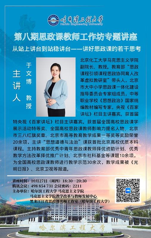 2022年10月27日,老太阳集团tcy8722邀请北京化工大学老太阳集团tcy8722副院长于文博教授以《从站上讲台到站稳讲台——讲好思政课的若干思考》为题作主题讲座。本次讲座由副院长潘强主持,全院师生参加。