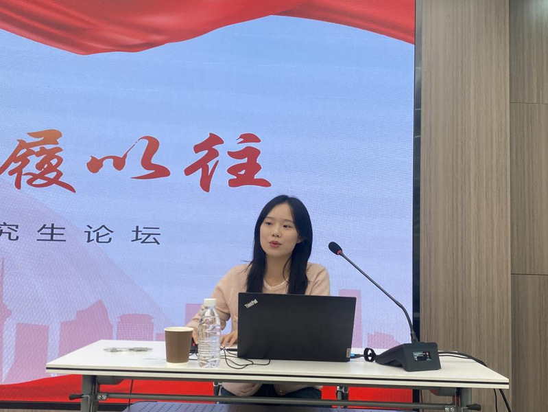硕士研究生房星含以“马不停蹄的赶路人”为题,从思想、学业、科研、实践四部分进行学术报告,并着重分享了其参与“挑战杯”、中国国际大学生创新大赛的经历。她详细介绍了此类竞赛的赛道设置、参赛流程、作品类别以及参赛要求,并结合自身参与项目,分享了如何选题、调研、撰写报告以及提交作品的经验,为在场研究生提供了经验借鉴。